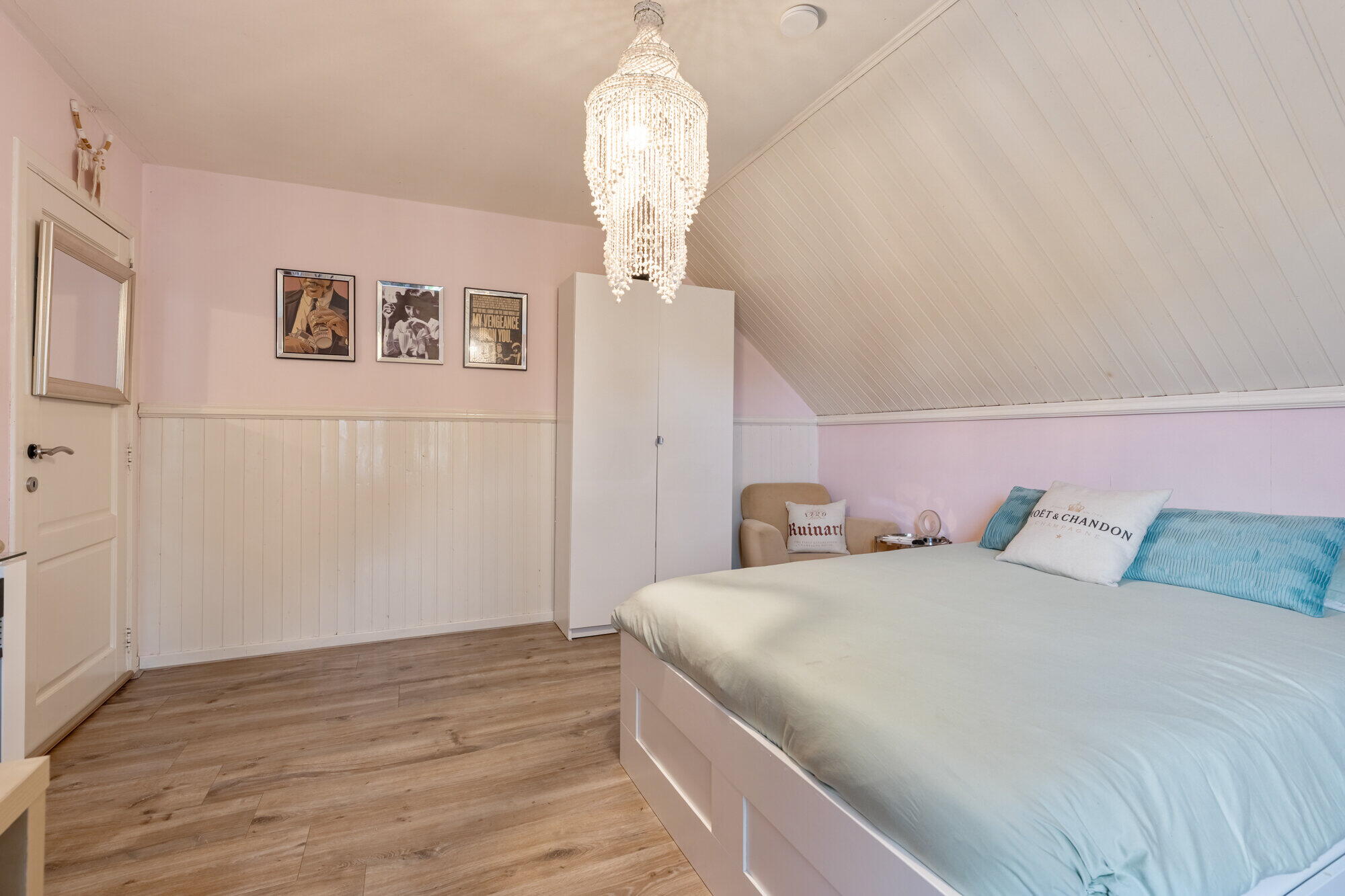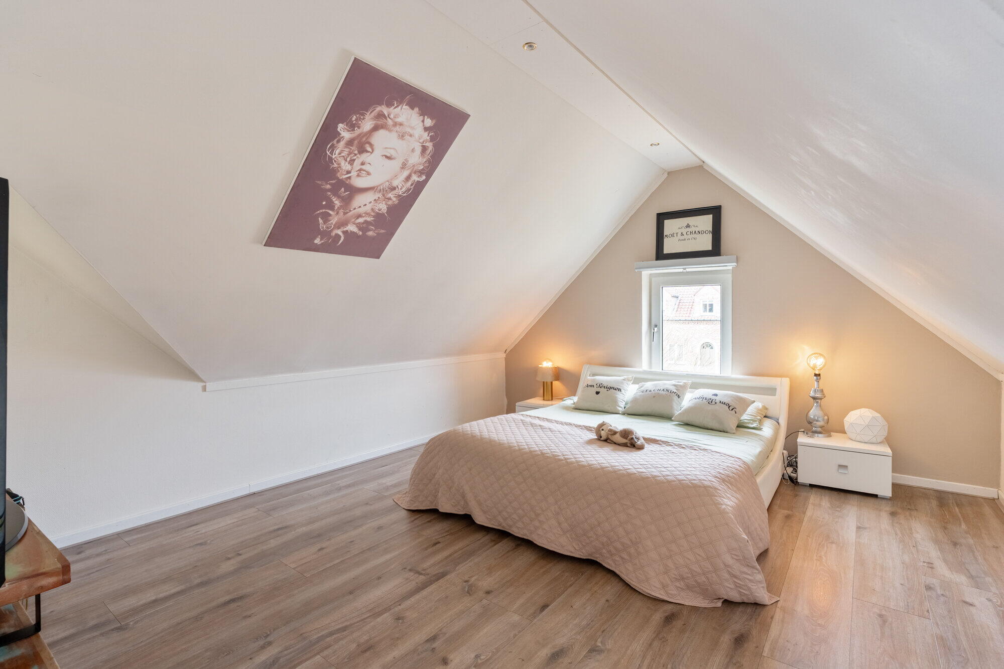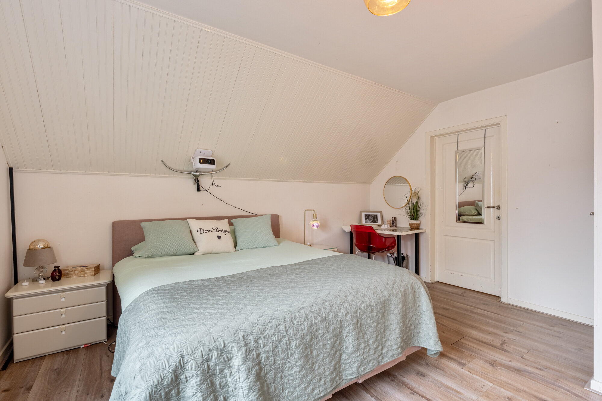 - Slaapkamer 2 van ca. 17.1m² met zicht op de zijtuin, laminaatvloer en gedeeltelijk schuin plafond;